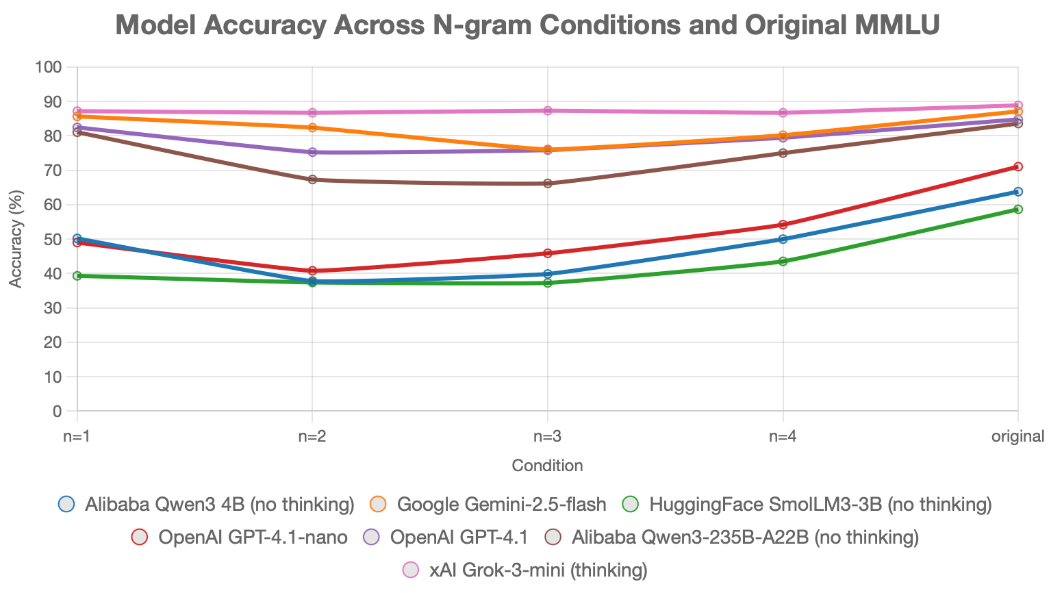 A robustness benchmark I built and published that rewrites MMLU questions into character n-grams (n=1 to n=4) to test how well LLMs read unconventional, hard-to-parse inputs. Benchmarked Grok-3-mini, GPT-4.1, Gemini 2.5 Flash, Qwen3-235B, and others. Grok-3-mini led with 87%+ across all n; most models dropped 20–30 points from the original.